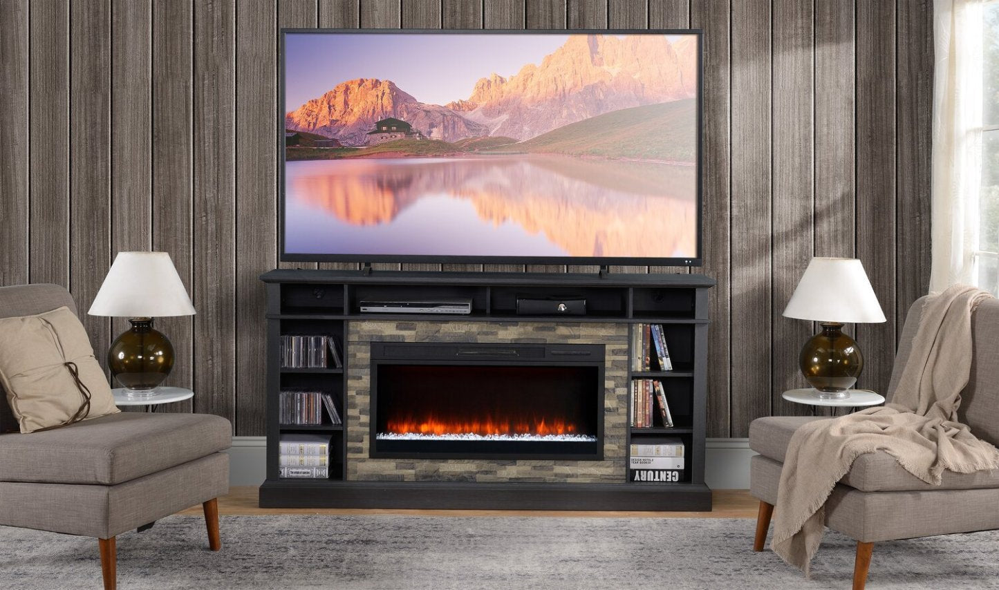 Meuble pour téléviseur Lappland de 70 po avec foyer électrique, rangement et système de gestion des câbles pour téléviseurs jusqu’à 80 po - noir