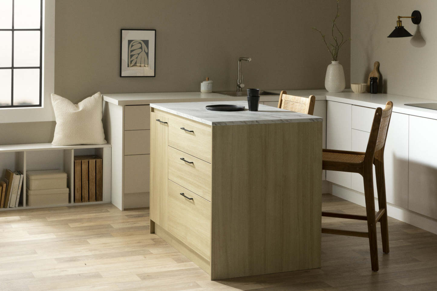 Myro Ilot De Cuisine Avec Porte Et Tiroirs - Faux Marbre Blanc Et Chêne Blond