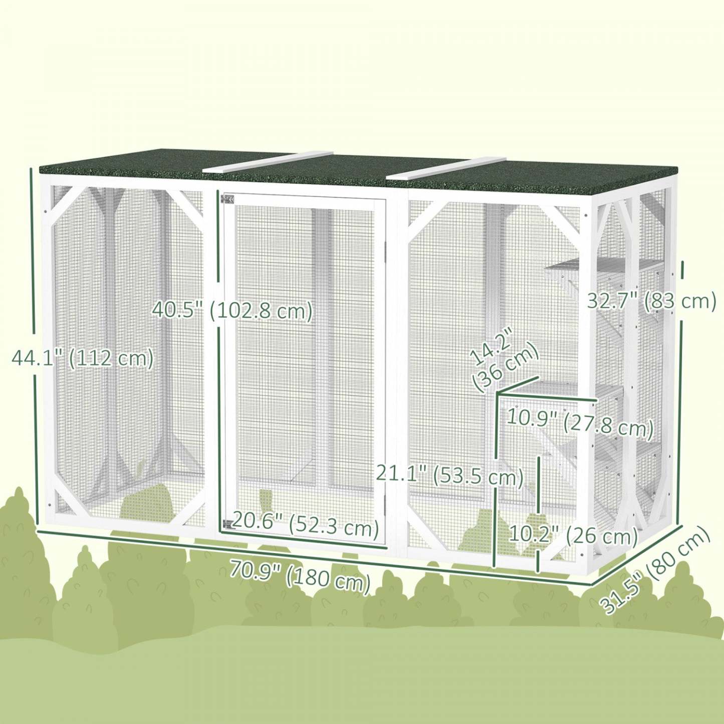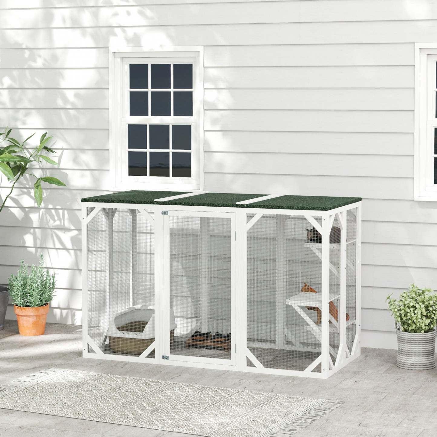 Êtes-vous fatigué de chercher un espace de jeu sûr et confortable pour votre adorable animal de compagnie ? Ne cherchez plus ! La cage pour animaux Pawhut est un foyer approprié et un habitat naturel pour plusieurs chats ou autres petits animaux. La structure en fil métallique, la peinture en spray et le cadre en bois de sapin offrent un espace sûr et protégé. La couverture en feutre bitumé est résistante à l'eau et au soleil, offrant à vos petits amis à fourrure une protection par tous les temps !