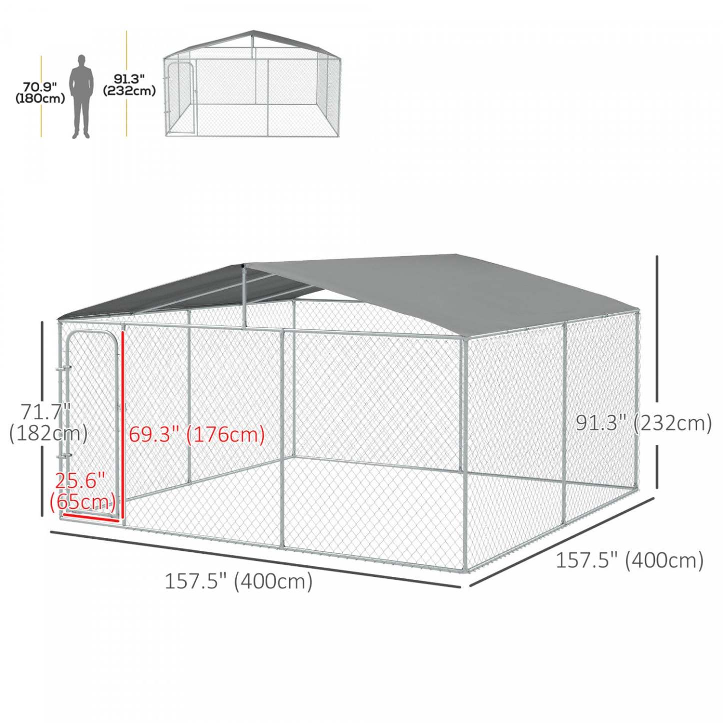 Avec ce grand chenil pour chien de Pawhut, votre chien peut profiter d'un espace extérieur sûr et amusant ! Cette enceinte pour chien offre à votre animal beaucoup d'espace pour jouer, faire de l'exercice et se détendre à l'extérieur dans l'air frais. Un cadre en métal galvanisé solide crée une structure stable adaptée à une utilisation quotidienne en extérieur. Le chien est protégé des dangers extérieurs grâce à la conception verrouillable. La couverture en toile garde votre animal à l'abri de la pluie et dans une zone ombragée. Le toit incliné permet à l'eau, aux débris et à la neige légère de s'écouler.