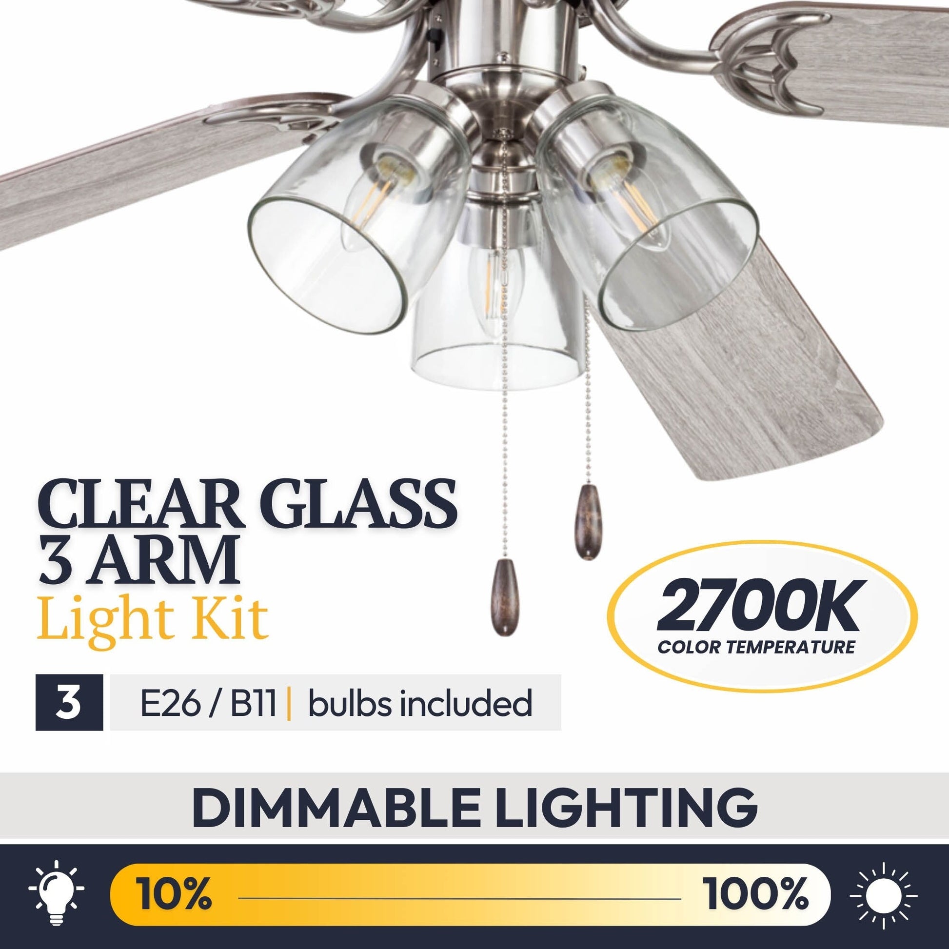 - VERRE TRANSPARENT : Ce ventilateur de plafond intérieur est doté d'un kit d'éclairage ramifié en verre transparent abritant 3 ampoules E26/Moyennes (Standard)/B11 (incluses).
