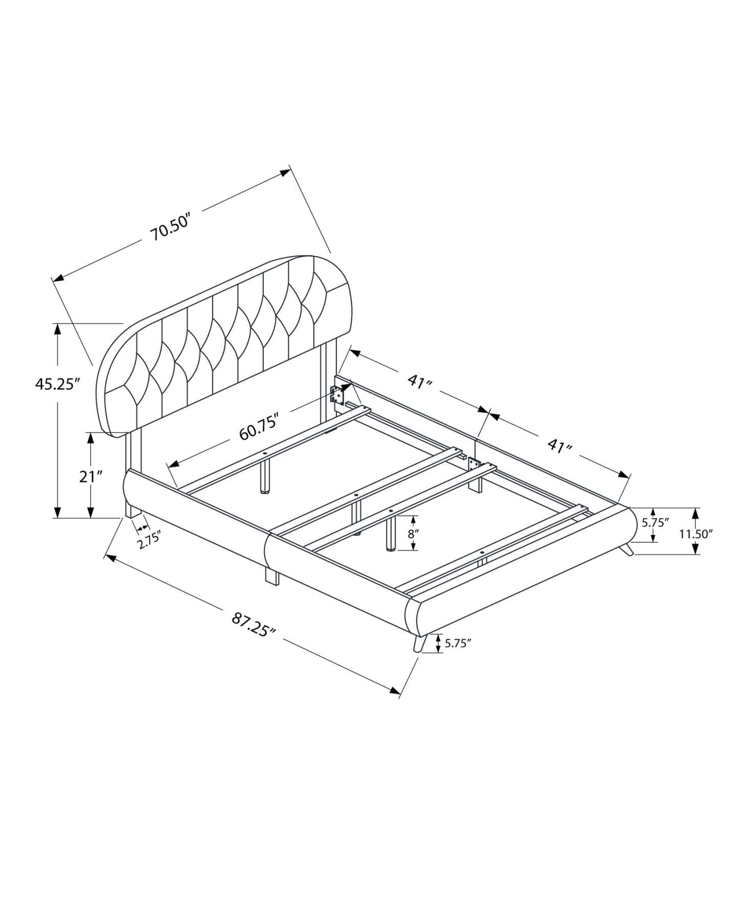 This is where your dreams begin with the classic retro styling of this rounded diamond tufted headboard, and clean lined frame for a subtle modern touch. The padded and upholstered queen sized low platform bed frame in a timeless dark brown leather-look fabric, is supported with sturdy brown wooden legs that are angled at the front to effortlessly partner with your style statement. The box spring and mattress is not included and must be purchased separately. We recommend a 2 inch low profile box spring. All parts and assembly instructions are included.