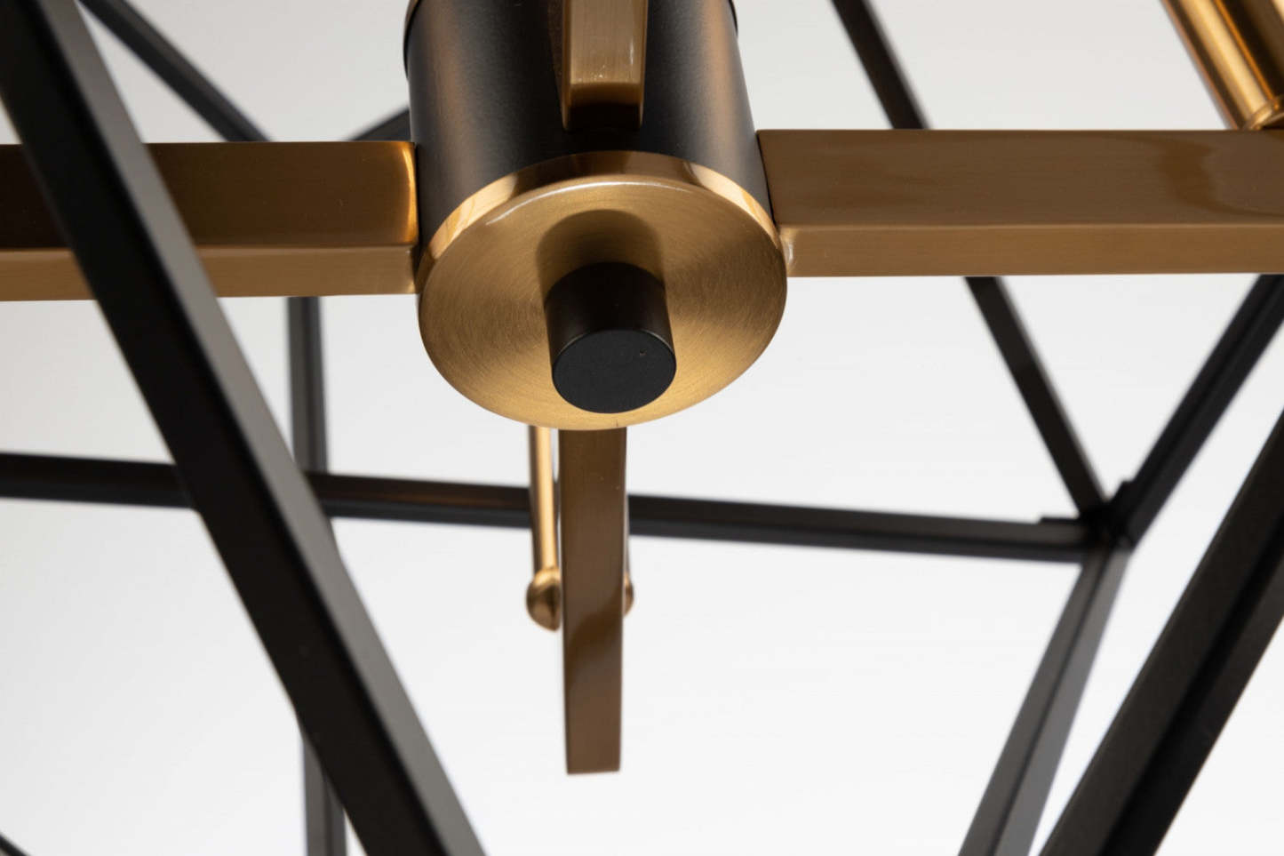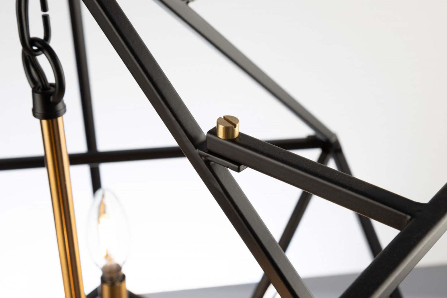 De conception linéaire, la collection Roxton se compose d'une cage extérieure noire mate ornée d'un losange inscrit dans un carré, renfermant un ensemble de luminaires intérieurs en laiton couleur récolte. Modèle présenté : 4 lumières (versions plus grandes disponibles).