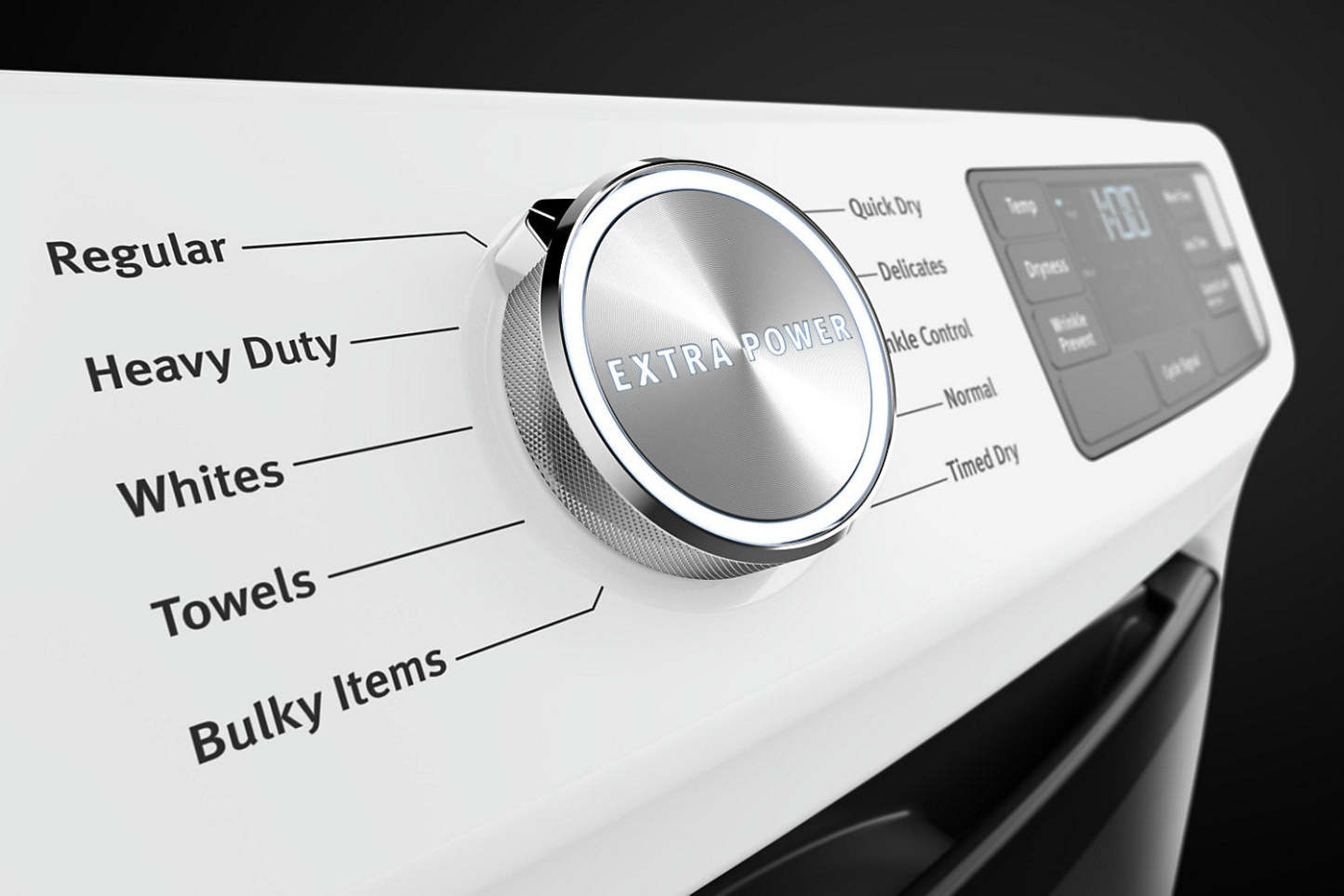 Lorsque les jeans épais et les grandes couvertures sont dans le sèche-linge, appuyez sur le bouton Extra Power du sèche-linge à gaz Maytag pour aider à sécher les tissus épais, les poches, les ourlets et les coutures du premier coup. La technologie Advanced Moisture Sensing surveille l'humidité intérieure et les températures de l'air pour aider à sécher et complètement les charges lourdes. Séchez une petite charge rapidement avec le cycle Quick Dry, qui s'associe bien au cycle Quick Wash sur certains lave-linge Maytag.
