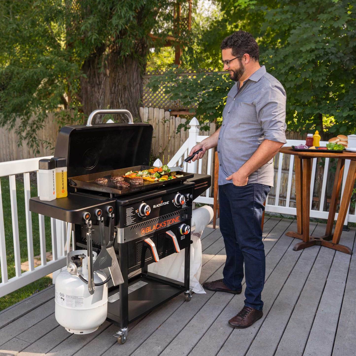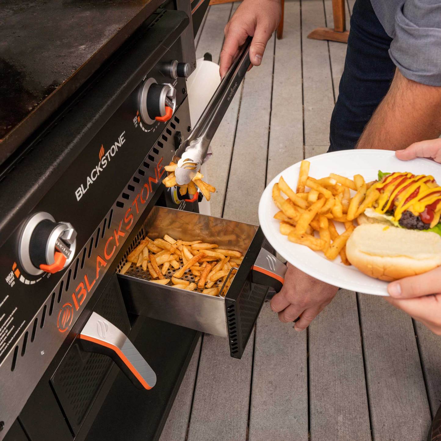 Avec deux zones de cuisson contrôlées indépendamment produisant un impressionnant 34 000 BTU, la Station de Griddle Airfryer Patio 28' est sûre de rapidement amener votre plaque de cuisson à la température désirée tout en faisant frire parfaitement n'importe quel accompagnement imaginable. Cette combinaison vous permet de préparer des hamburgers et des frites sans jamais quitter votre plaque de cuisson. Avec une capacité de friture de 4 quarts, préparez facilement un accompagnement à partager que vous pouvez déguster en famille.