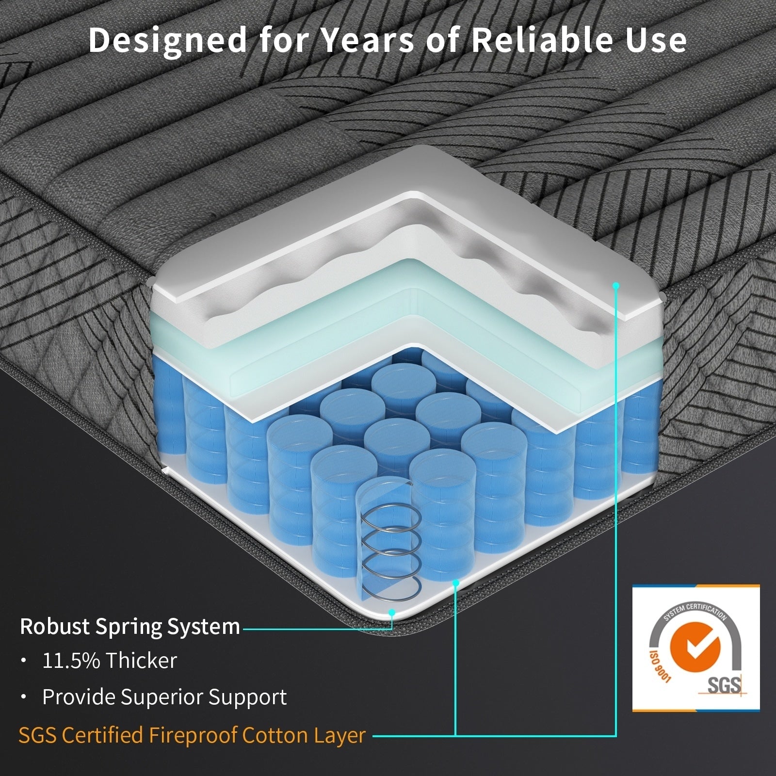 - Ressorts hélicoïdaux 11,5 % plus épais que la norme du marché : offrent un meilleur soutien, une durée de vie plus longue et empêchent l’affaissement.