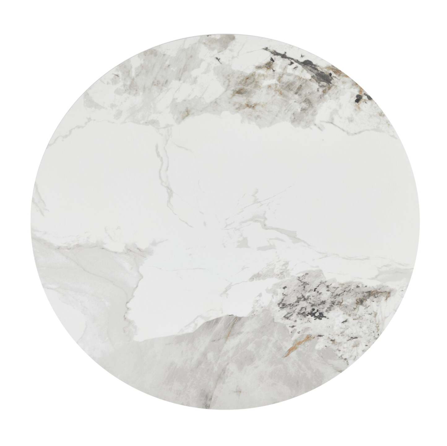 Faites ressortir votre espace de repas avec la table à manger Alwin. Une base en forme de sablier dramatique présente une finition en bois de cerisier synthétique brun riche avec des accents noirs et dorés qui soutiennent magnifiquement le plateau de table en pierre frittée ronde. La surface en pierre blanche et grise est non poreuse, résistante aux rayures et facile à entretenir, ce qui la rend à la fois magnifique et pratique. De plus, elle est conçue pour accueillir confortablement quatre personnes, parfaite pour les petits espaces. En alliant design moderne et fonctionnalité, l'Alwin apporte un charme indéniable à votre salle à manger.