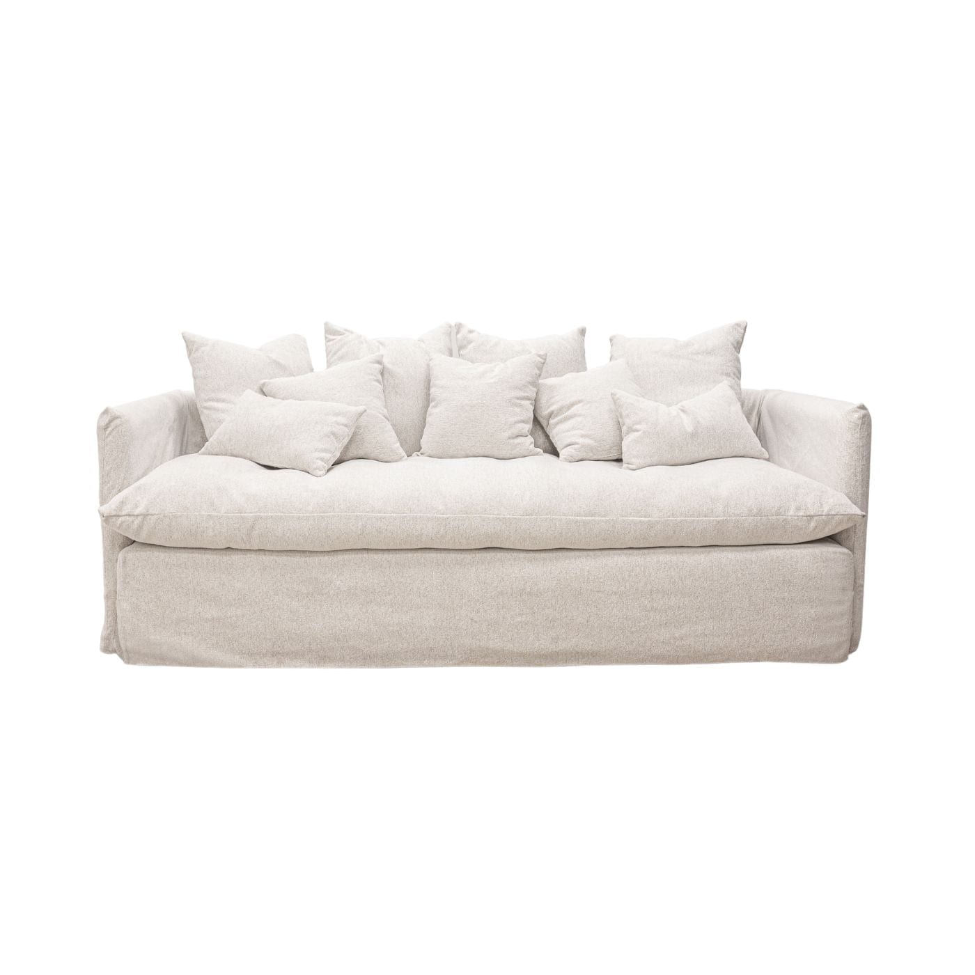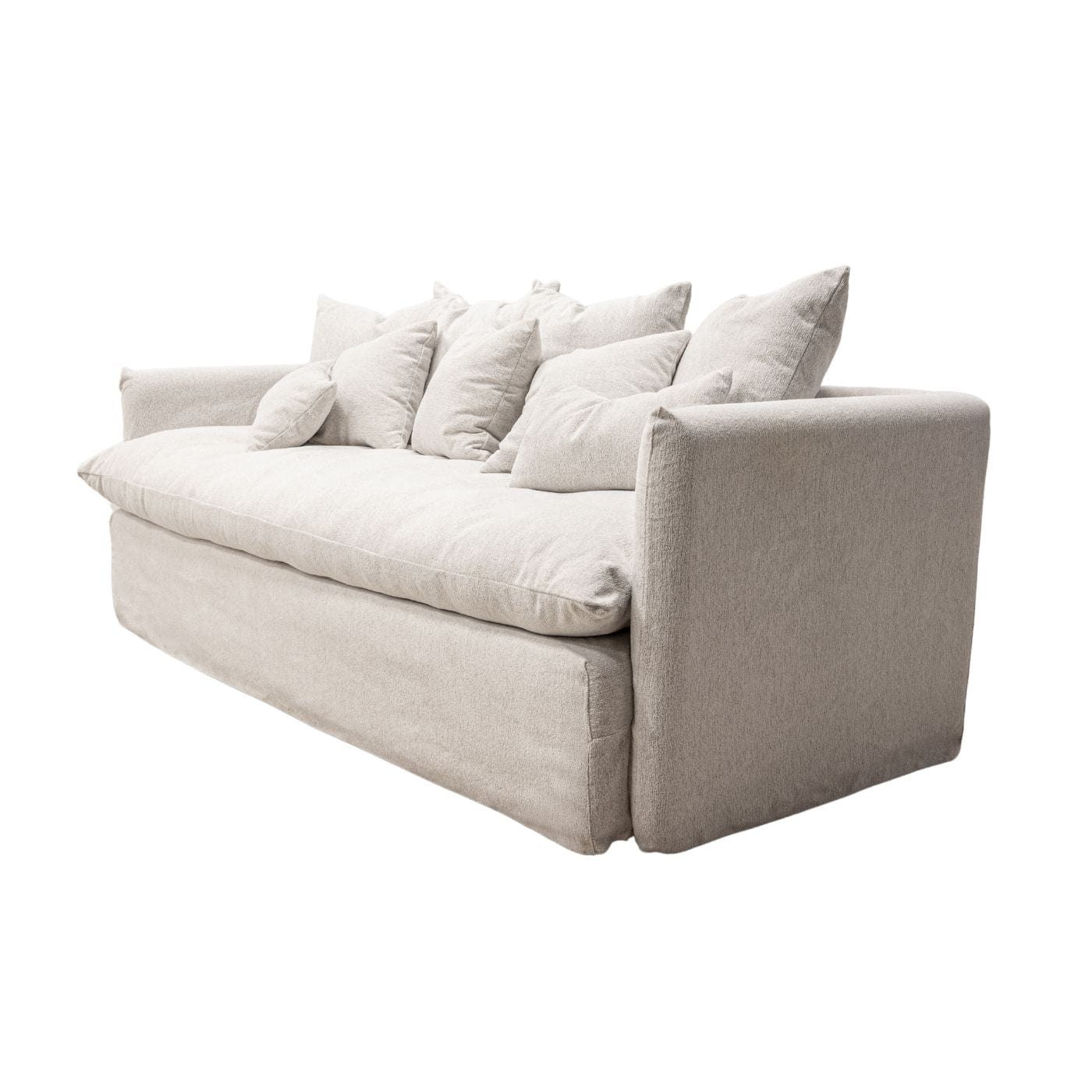 Modèle Tarifa Decor Pillows : canapé 3 places (240 cm) recouvert de tissu Vibe , coloris Sandwhite . Un textile résistant et facile d'entretien, fabriqué à partir de fibres recyclées. Comprend un ensemble complet de coussins assortis. Déhoussable. Fabriqué à la main en Espagne.
