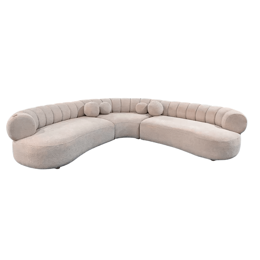 Canapé sectionnel incurvé en tissu couleur amande avec cannelures verticales . Un design sculptural et discret, idéal pour les salons modernes.