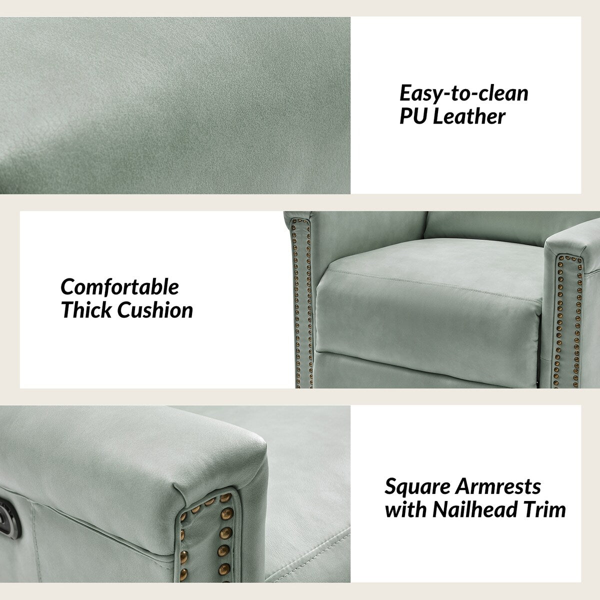 - Garniture de clous en cuivre : ornant les bords du cadre de l'ensemble de fauteuils inclinables, la garniture de clous en cuivre ajoute une touche de sophistication et de raffinement, accentuant le charme traditionnel de l'ensemble de fauteuils inclinables et conférant une esthétique luxueuse à la conception globale.