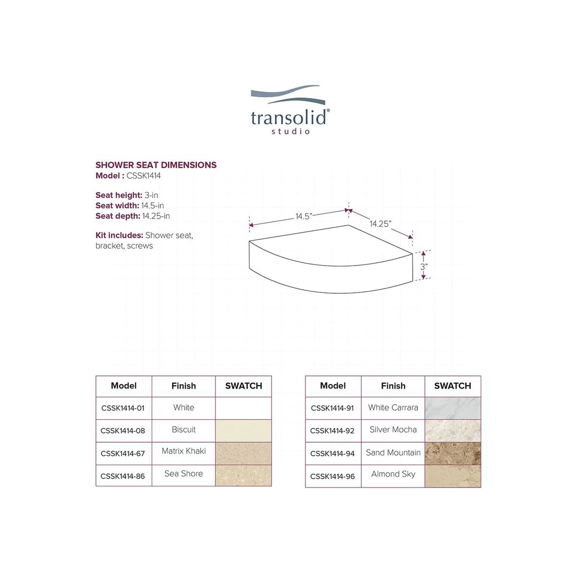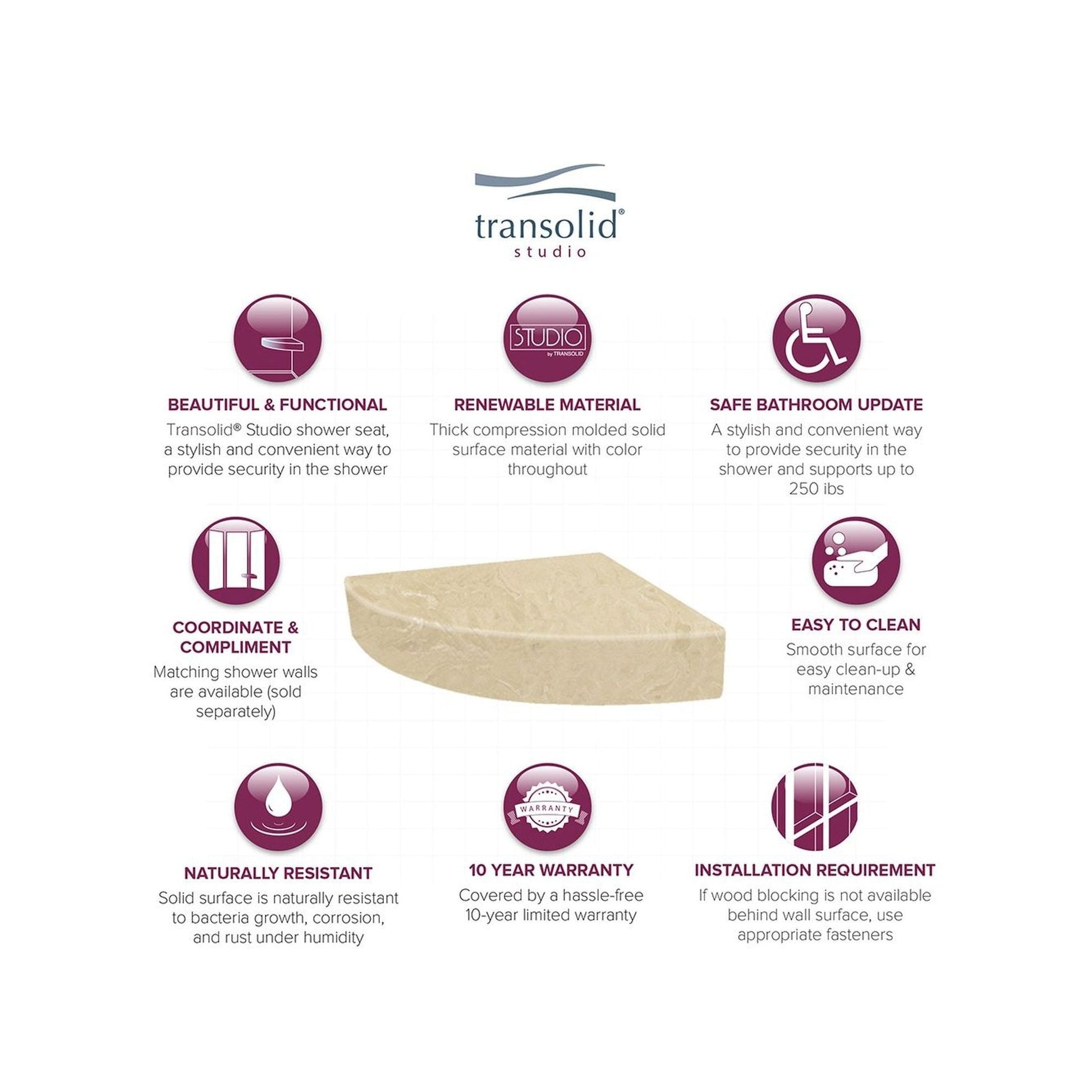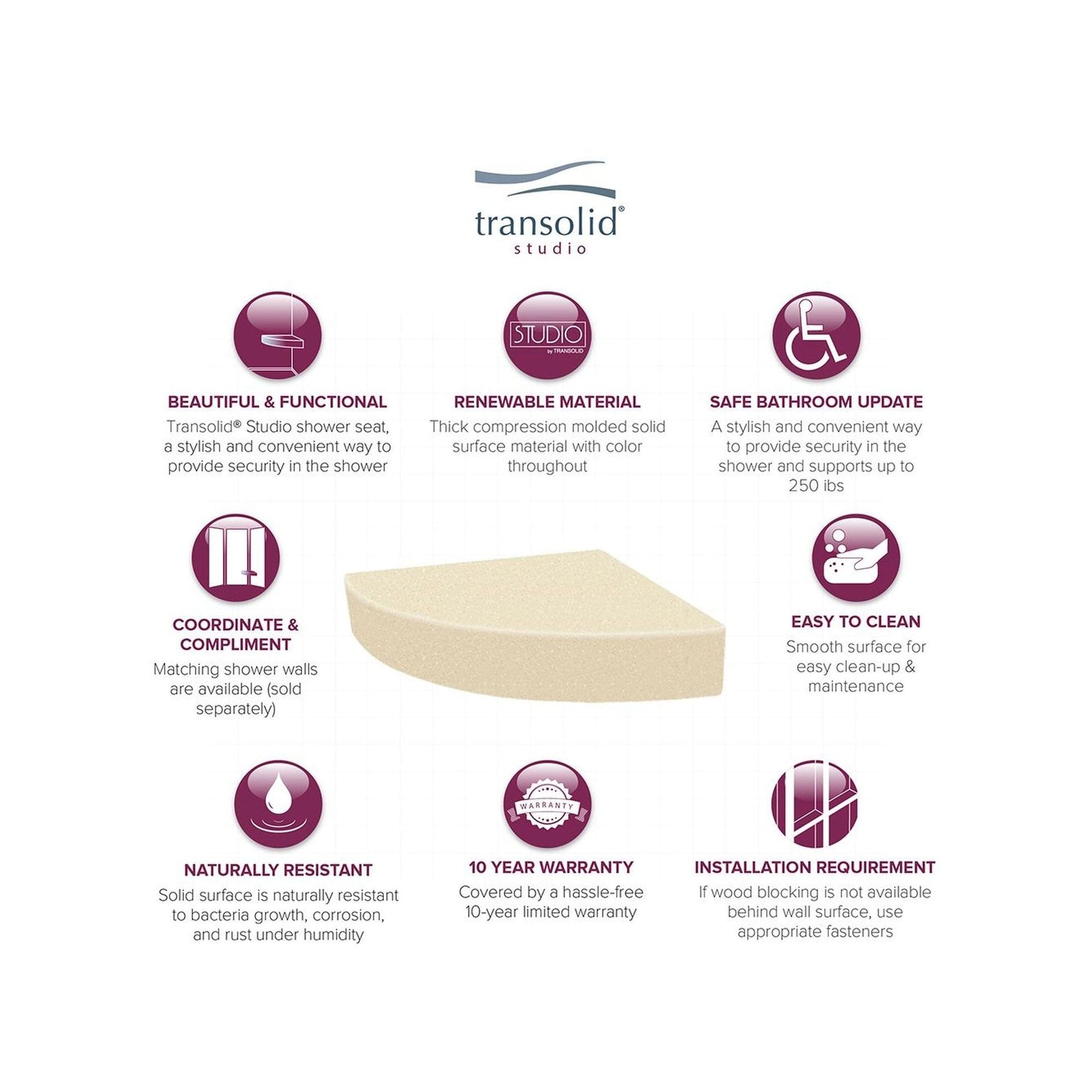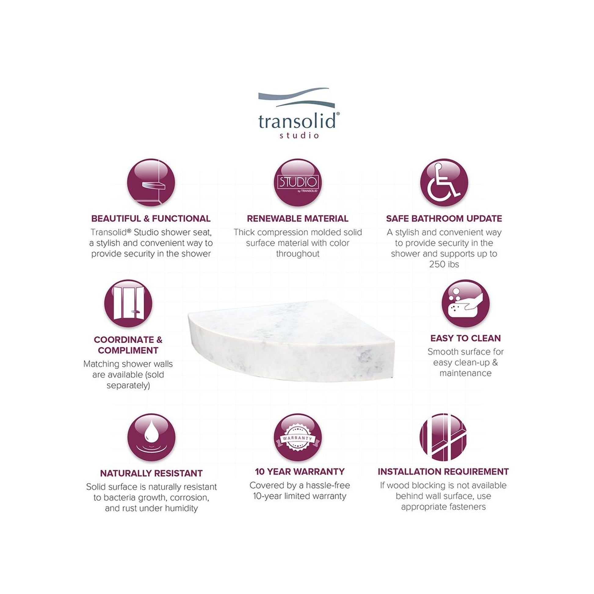 Siège de douche d'angle mural en surface solide Transolid Studio 14 po x 14 po - 14,5 x 14,25 x 3