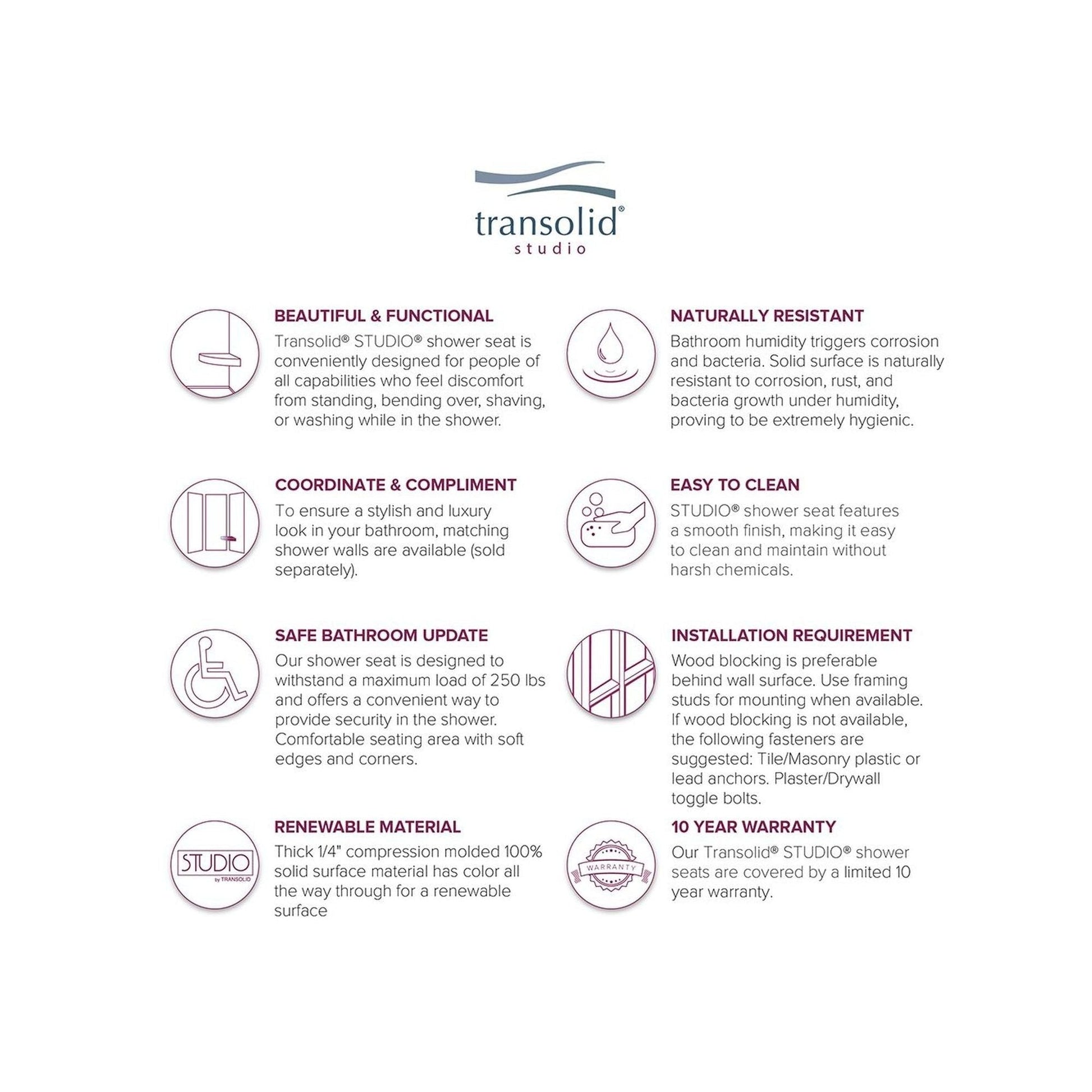 - Le kit comprend : un siège de douche Transolid, un support de montage en acier inoxydable, des vis à tête cylindrique en acier inoxydable